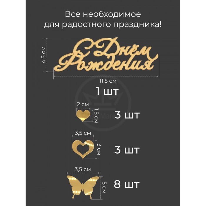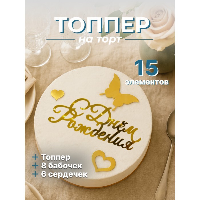 Топпер зеркальный Сднем рождения (Бабочки 8шт, Сердце 3шт), золото 266158