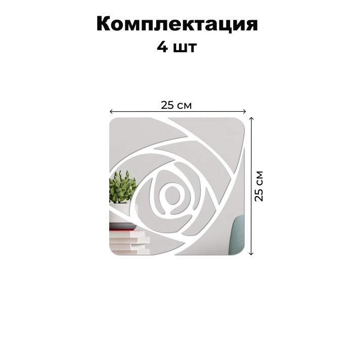 Интерьерные зеркальные наклейки Квадрат-Роза (4 шт - 25*25 см, ТРАФАРЕТ) серебро 265974
